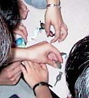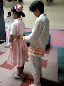 ↑榎本の着付けをする上野。ちょっとやらしい感じ。 |
