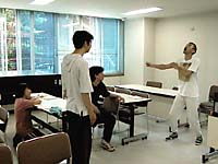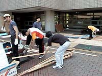 6月13日 しかし仮組みの途中で風が強くなり、危険なため中止。とはいえ、組む上での問題点等が明らかになり安心。 夜は仕事帰り組と合流して稽古。場所が体育館しか取れずダンスチームの練習と同居する羽目に。ダンスはなかなかハイレベル。 参考になるねえ。しかし、音楽がんがんの中での稽古は、かなりの神経の集中を要する。おかげでいつもより緊張感のある稽古になった。かも。 |