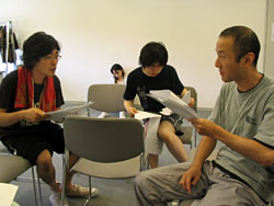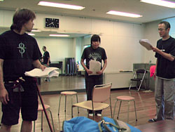 さて、所用で長らく留守にしてまして、本日久々の稽古参加です。 しかしまあ当然なのですが このギャップだか何だかをとっとと埋めなくては。では。(堀) *「稽古に復帰する時には台詞が全部頭に入っているはずです!」と言っていた(もとい言わされた?)堀。稽古場に残されていた他の役者も負けじと頑張っていたのだが、上記の写真を見ても分かる通り、脚本を手放している者はこの日の時点では誰一人いないのだった。