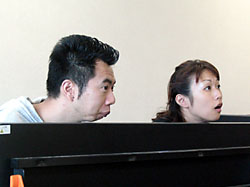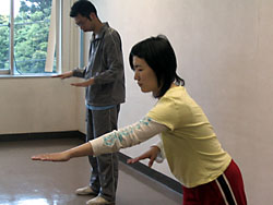 あれあれ、少し寂しいなあと思いつつ、江平氏指導のヨガからWSはスタート。・・・私ダンス習ってるんですが、そのくせ体硬いんで、江平氏の体の柔らかさが本当に羨ましいかぎりでした。柔らかくなりたいよぅ。 今日は、顔だけ、足だけでシチュエーションを演じてみよう、という課題をやりました。台詞一切なしです。 最後に、ちょこっと脚本読みをさせてもらいました。数年お芝居離れている私としては、ちょっと嬉しかったです。いろいろ私の演技にダメが入りました。やあ、でもどんぴしゃです。私のおっきな壁でございまして、精進しなきゃと思いました。 アドリブが苦手で、いつもエチュードなどの基礎練習のときには「どうしよーどうしよー」と頭でっかちになる私ですが、今日は割とリラックスして楽しめたと思います。 *写真は左が池野、右がさとうさん。「映画を観る」というお題を顔だけで演じているところ。一体どんな内容の映画なのだろう。さとうさんは普段は「ハマこい」(「よさこい」の横浜版)のチームで活動中。夏はいろいろなイベントで活躍の予定だ。(江平@管理人) |