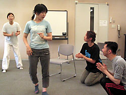 遅れて行くと、江平指導の「YOGA講座」が開かれていた。ゆっくりと呼吸しながら、あちらこちらを伸ばしていく。とても気持ちよさそう。 芝居から離れている私であるが、ワークショップ参加は、 *写真は上の文中にもあるフィットネスクラブが舞台になったエチュードで、勘違いをした太田尾が演歌歌手として登場した場面。左から初参加の石川さん、太田尾、昨年ワークショップに参加して以来受付などのお手伝いをしてくれているさとうさん、池野。(江平@管理人) |