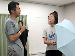 まずは江平さんの指導の下ヨガで身体をほぐしました。 その後は発声練習から立ち構え方、7段階で笑ったり、10段階の緊張・弛緩など。そして私はなんとも脚力がないことがありありと判明いたしました。すぐふらふらしてしまいます。これは今後克服すべき課題です! エチュードもやりました。池野さんと2人でいろんな状況や役柄に挑戦しましたが、どれも凄く楽しかったです!特に楽しかったのは、全く違う最初と最後の状況を決め、何とかして最後の状況に持っていくというもの。ありがちなシチュエーションになってしまいましたが、テンションがどんどん上がるのがわかりました。 そして最後は皆で職業当てクイズ(※下記管理人注参照)をやりました。何だか小さい頃に母や弟とやったクイズに似てて懐かしい感じでした。 そんなこんなであっという間でしたが、とっても充実した時間が過ごせました。参加して良かったです!ありがとうございました!(多木) *写真は「傘」を中心に話を進めるエチュード(即興芝居)。左が池野、右が多木さん。多木さんは湘南地区で活動する演劇ユット・ムゲン88のメンバー。(ご自身のブログ→「頑張り過ぎない毎日。」)5月に初めてWS参加希望のメールを頂いて以来、お互いの都合が合わなかったり、急に仕事が入ってしまったり、お父さんが倒れてしまったり!(もう回復されたとのことで良かった)と、『君の名は』ばりのスレ違いが続いていた。やっとご対面出来て感無量という感じ。せっかくのご縁、大切にしたいものだ。 |