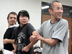 *大病は時間が掛かったがなんとか無事治ったらしい。皆さんも健康には気を付けて。日頃の自己管理はもちろん、おかしいと思ったらちゃんと医者に行きましょう。写真は左から岩井、Qui-Ta、小島。先週の通し稽古には無かった新技。(江平@管理人)
