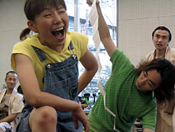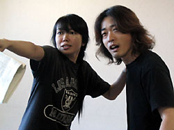 写真はその後半のシーン。久々に観たら初見のギャグやアクション満載で、大いに楽しませてもらった。左が大澤、右が岩井。後ろにちょっと体が見えているのがQui-Ta。ひどい風邪も、これがUPされた8月半ばにはすっかり治った様子。(江平@管理人)