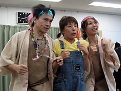 *この日は衣裳も着用しての通し稽古。写真は左からTAIRA、大澤、さとう。TAIRAとさとう(と、3人の後ろにちょっとだけ頭が見えているQui-Taと岩井)の衣裳は「タケノコ族」とか「ヤマトタケル」とか言われていたけれど、はてさて何の役なのか。観てのお楽しみ。(江平@管理人)