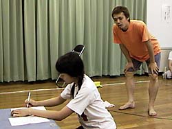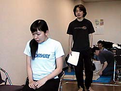 *TAIRAは稽古開始時間に稽古場にいることがほとんどないと言っていいくらいの言語道断の遅刻魔だが、この日は珍しく早々と稽古場に到着したらしい。本番も近くなり稽古時間が限られてくるこの時期、是非この調子で時間厳守を続けてほしいものだ。写真は(左)小島、(右)岩井。(江平@管理人)