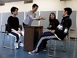 *ながともは新しい劇団員。2001年12月22日のワークショップ日誌で「Nさん」と紹介されている人物。ワークショップに参加したことがきっかけで今年8月の第7回公演に参加することになった俳優だ。写真は焼肉屋のエチュード。左からYさん、池野、ながとも、松澤。 |