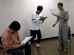 *出演が決まって以来自宅で筋トレを続けてきたと豪語していたQui-Taだが、ブランクは予想以上に大きかったようだ。だが脚本を持っての稽古に入るとその粘りのある(?)芝居センスの健在ぶりを見せた。写真は左から羽田野、矢野、Qui-Ta。(江平@管理人) |