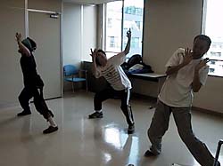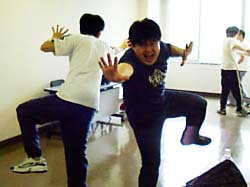 *大澤は肉体訓練中にひざを負傷してしまったため、その後は椅子に座っての参加。11月の公演参加には支障がないが、完治までの間は無理せず養生しながら稽古することに。準備運動もしっかりやり、いつもより調子も良かったとのこと。不調の時よりそんな時にこそ事故は起きるものか?気をつけよう。写真は左から江刺、TAIRA、Qui-Ta。(江平@管理人) |