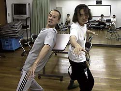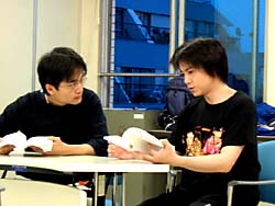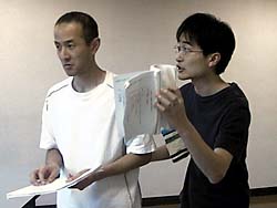 *この日は演出家が仕事の都合で夕方からの稽古参加。それまでの時間は自主稽古に。写真は自主稽古で煮詰めたネタを演出家に披露するQui-Ta(左)と江刺(右)。舞台では二人の息の合ったアクション(?)をお見せできることだろう。(江平@管理人)
