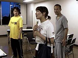 *私(江平)は新潟県出身だが、「母音の無声化」については会得しているようだ。個人的には訛りもその土地その人の持ち味なので好ましいと思うのだが、役者にとっては自分がどう話しているかを意識化に置きコントロールする能力も必要だ。写真は左からTAIRA、大澤、Qui-Ta。(江平@管理人)