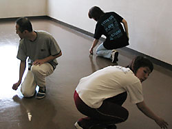 ストレッチや発声練習と言った基礎練習をいつもよりゆっくりひとつひとつ説明しながら行う。どの劇団でも似たような内容かもしれないが、演出家の、演技や身体に対する基本的な考え方が伺える部分。基礎練習はただ稽古の前の準備運動としてではなく、その日の自分の身体の調子を確認したり、身体に対する感覚を養ったりすることも重要な目的。各人がその目的を意識して行うことが大切だ。