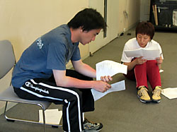 * 「スローモーション ―500円玉めっけ―」については、この下にある5/15の写真を参照のこと。上の写真は本読み風景。左がTAIRA、右が大澤。(江平@管理人)