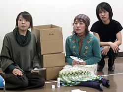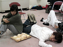 *稽古場ではタチの悪い風邪が一部で猛威を振るっている。江刺も好きなお酒や煙草を断って、回復に努めたらしい。写真は左から江刺、小島、稲葉谷。(江平@管理人) |