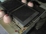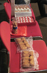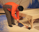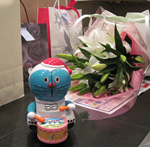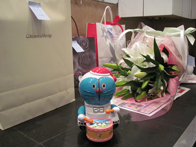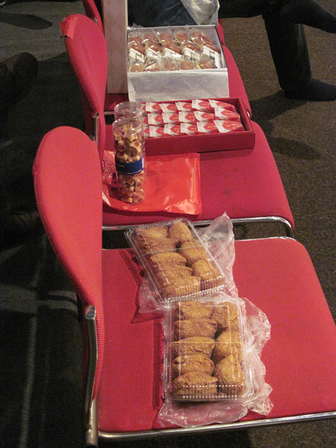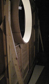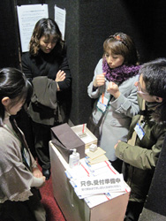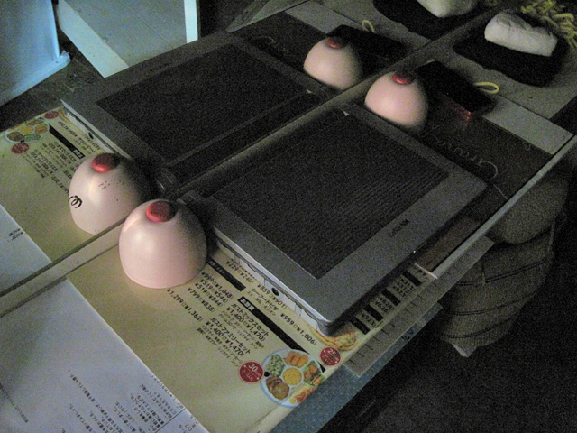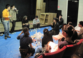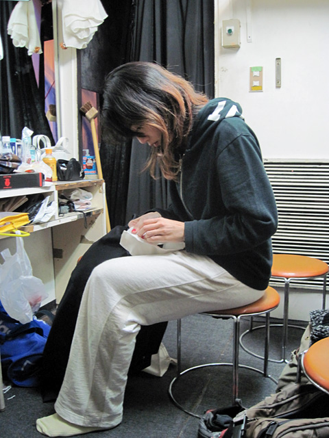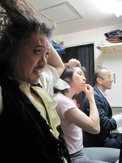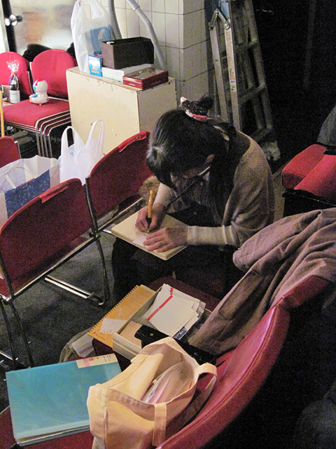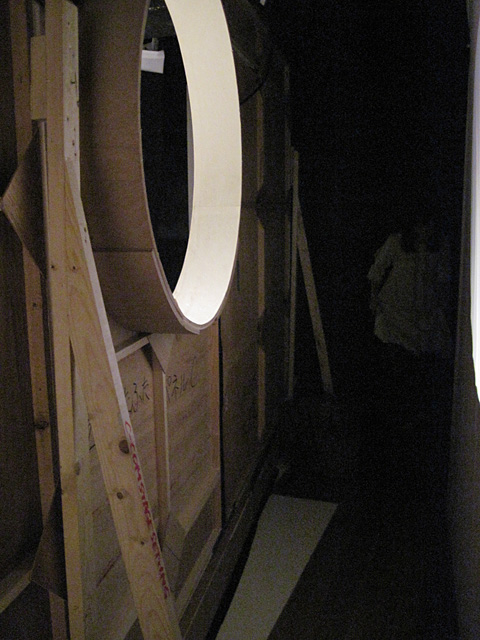 ↑上「ウララちゃん」他、ソデの鏡前で待機する小道具達。並んでるとなおさら「おっぱい」っぽい。下は役者の皆に不評だった、裏を通る時にかがまなければならない窓付きパネル。