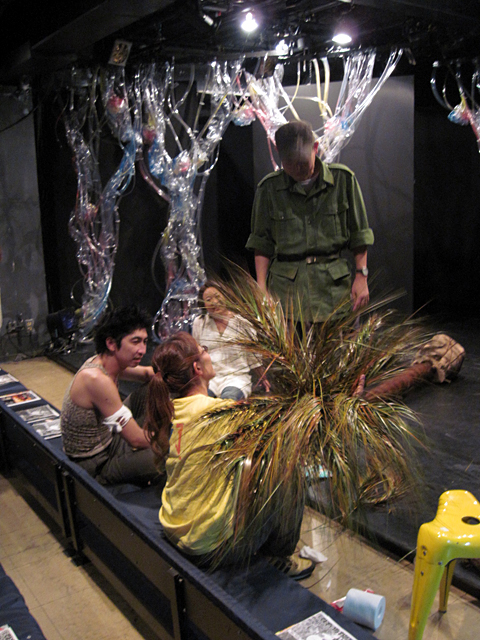 ↑ダメ出し中のスタッフの皆さん。中央奥に見えるのが、音響オペの香田氏と照明プラン・オペの原氏。千秋楽では、息の合った完璧なオペレーションで舞台の完成度を高めてくれた。 |