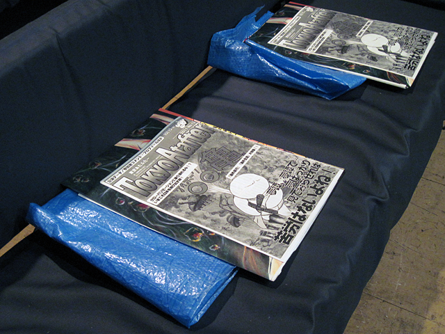 ↑こちらも大澤の力作、「植木」。初日昼の回に青山が破壊してしまい、夜の回が始まる前に急いで修理。上の写真は壊さないコツを伝授しているところ。 |
