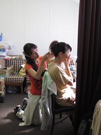 ↑V.(小木)の髪型は、ああでもないこうでもないと女性陣総出での試行錯誤の上、ようやく決定された。公演当日のセットは衣裳の佐藤が担当。女子力の見せ所です。 |
