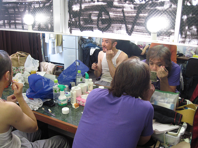 ↑男性陣でメイクに力が入っていたのはこの二人。(ていうか他の三人はほぼノーメイク)楽屋にいる時間が長いと、どんどん濃くなって行くので要注意。「汗で流れた芝居後半くらいがちょうどいい」との評判にもへこたれずせっせとメイクに励んでいた。 |