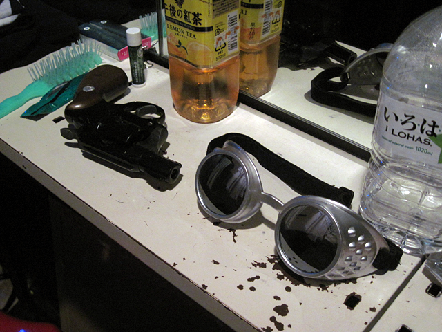 ↑舞台裏の小道具置き場から。神崎の銃とゴーグル(は神崎じゃなくて「飛行機から落ちる男」?)。 |