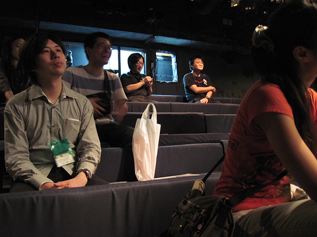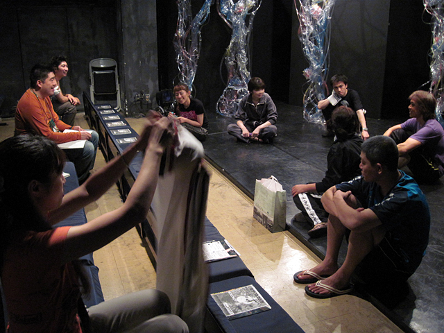 ↑公演後のダメ出しタイム。本番中演出の羽田野は、客席とオペ室の間のスキマにひっそりと(?)はまり込み、ダメを書き取っていた。 |