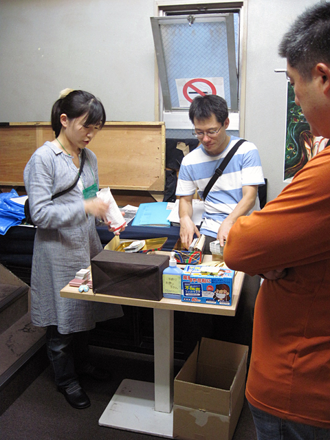 ↑前回公演は新型インフルエンザ騒動真っ最中。その時お客様用に買いだめたマスクや消毒ジェルが残っていて今回も受付に装備してみたものの、前回程の利用率ではなかった。 |