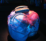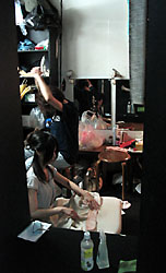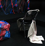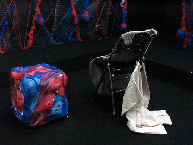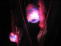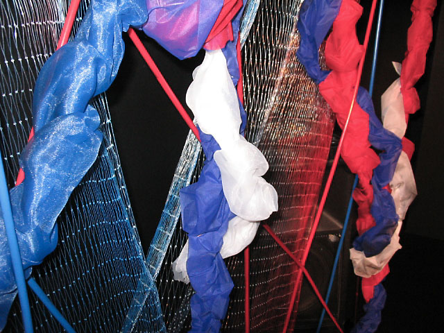 ↑舞台装置の吊りものを拡大。テグスネット+塩ビチューブ+ナイロンシャー(布の名前)+スプレー塗料+ホチキスと、全くもって地球に優しくない素材ばかり。