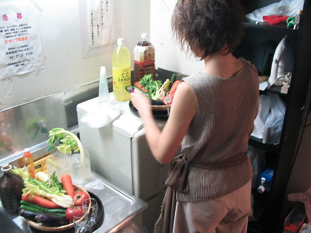 ↑劇中の『偲び尽くしの宴』で供される夏野菜達をセッティングするさとう。本番ではキュウリの匂いが客席まで漂って来たとか。