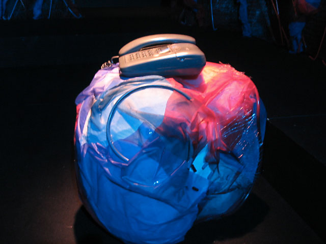 ↑イスやテーブル等様々に使用されていたオブジェ。これは上手に置かれていた『まるさん』。頭の上に電話を乗せられているみたいでちょっと気の毒な感じ。ちなみに下手に置かれていたのは『しかくさん』。