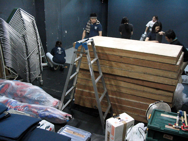 ↑公演終了後、あっという間にバラシ。左手にす巻きになっているのは舞台装置の吊りもの。包帯が巻かれたミイラか、魚のホイル焼きといった風情。