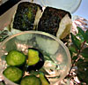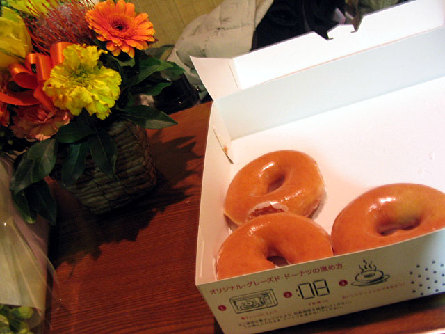上は並ばないと買えないという「クリスピー・クリーム・ドーナツ」。下は手作りおにぎりと漬け物。どちらもとてもおいしく頂きました。