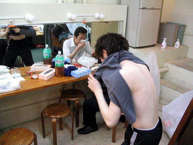 ↑男子楽屋でのセクハラ写真。堀は女性の役だったので、ホントは女子楽屋に行きたかったとか。
