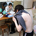 ↑老け役ということで、顔にシワを描き、頭に白い粉を歯ブラシで叩き付けるQui-Ta。少ない毛髪ではなく、地肌を白くしているだけではとの声も。